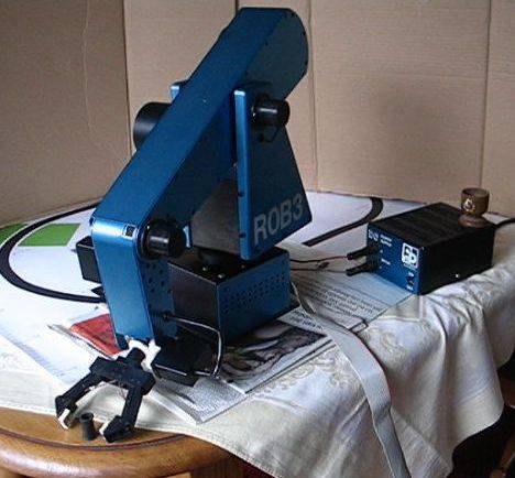ROB3 ist ein 6(5)-Achsen Roboterarm (5 Achsen + Greifer). Er kann mit Hilfe der mitgelieferten Teachbox oder mit Hilfe eines PC über die RS-232 Schnittstelle gesteuert werden. Mit der Teachbox können auch Programme erstellt werden, die im Roboter gespeichert werden (nicht-flüchtiger Speicher). Auch mit dem PC erstellte Programme können im Roboter gespeichert werden.
